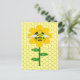 Este cartão postal fofo apresenta uma imagem gráfica de uma adorável abelha melífera amarela com listras pretas, olhos, antenas e pernas. Tem lindas asas azuis e brancas. A abelha está sentada no meio de um girassol amarelo dourado. A flor tem um caule verde e três folhas. A mensagem "feliz dia da abelha" aparece espalhada pelas três folhas. O fundo é composto por um padrão de favo de mel amarelo.