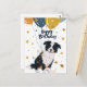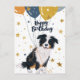Um lindo pastor australiano com balões de aniversário deseja Feliz Aniversário