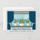 Um belo cartão de aniversário de casa feliz com uma bonito janela cheia de lindas plantas suculentas. A janela está coberta com belas cordas azuis acima do texto personalizado da sua empresa. Um cartão postal de marketing imobiliário para clientes anteriores.