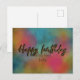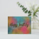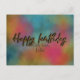 Design moderno e atual de cartão postal de aniversário personalizado com o texto "Feliz aniversário" escrito em letra de glitter dourado falso sobre um fundo colorido de aquarela.
