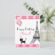 Este design de Paris chic mostra a torre Eiffel com um gato com corações e balões cor-de-rosa reluzentes com bordas brilhantes de coração cor-de-rosa. Personalize facilmente este cartão de aniversário feliz com um nome, endereço e saudação de aniversário em na moda preto e rosa.