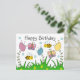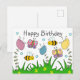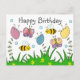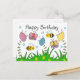Lindo cartão de aniversário da natureza para aqueles que amam insetos e flores, O design mostra três flores coloridas crescendo de grama verde longa. Voando em torno das flores estão duas abelhas amarelas e pretas e duas borboletas coloridas. Na parte superior da frente do cartão está escrito feliz aniversário em texto cinza escuro.