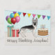 Ilustração de desenho animado original de Destei de um cão da raça Pastor Alemão cor sable prateado / preto e prata. O cão é colocado em uma colorida cena de aniversário. Há um bolo de aniversário com algumas velas, balões coloridos de aniversário e uma faixa de bandeirinhas, além de duas caixas de presente. Há também uma área de texto personalizável.
