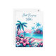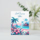 Arte pixelada que parece bordado que retrata uma imagem de um oceano azul, palmeiras e flores tropicais cor-de-rosa. Feliz Aniversário.