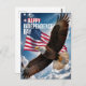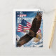 Cartão-postal Feliz Dia da Independência em 4 de julho. Uma águia-careca majestosa a soar com a bandeira americana no fundo simboliza a liberdade e a força. As saudações no fundo, como desejado.