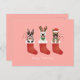 Ilustração de três Bulldog Franceses numa estocagem de Natal. Todos os três cães estão vestindo roupas únicas de Natal para o Natal.