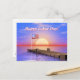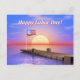 Cartão postal com a minha trabalho de arte digital de uma cena ao lado do lago de uma doca, bandeira dos EUA e um sol de fixação. O texto diz "Feliz Dia do Trabalho!"
