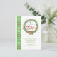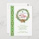 Um postal de saudação de Natal com uma coroa aquática. Agulhas de pinheiros verdes, cones de pinho e bagas decorativas constituem esta coroa festiva. Dentro a coroa são alguns ornamentos decorativos e as palavras" podem ser Feliz e Brilho. Escrito em uma fonte vermelha da moda. Um padrão verde e vermelho com quadrados brancos ao longo da fronteira.