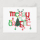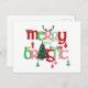 Feliz e Natal brilhante em letras vermelhas e verdes com ornamentos retrorreflectores, árvore de Natal e galhadas.