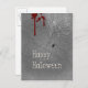 Uma ilustração assustadora do Dia das Bruxas apresentando uma teia de aranha com uma aranha preta pendurada, gotas de sangue e a inscrição "Feliz Dia das Bruxas" escrita com ossos em uma caserna.