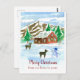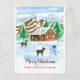 Um cartão-postal de Natal "Feliz Natal da nossa casa para a sua" decorado com uma pequena cabana vermelha no bosque, enfiada contra uma cordilheira, e tudo é fosco de neve com cervo na frente do pátio curioso sobre o boneco de neve ilustrado com aquarela. Você pode editar o texto para ajustado das suas necessidades.