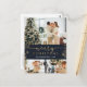 Cartões postais Feliz de Natal com endereço de retorno com multicolagem fotográfica (4 / 4 imagens), caligrafia manuscrita falso em folha de ouro e borda do poste, contra fundo azul escuro. Personalize facilmente as suas imagens, cores e texto favoritos. NOTA: para ajustar o assunto das fotos (na parte inferior), digite a ferramenta design, selecione a foto e escolha a ferramenta de recorte. Mova a caixa para cima ou para baixo e escolha o seu lugar favorito.