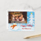 Personalize a frente e o verso deste cartão postal de Natal com fotografia divertida. Adicione sua foto e texto a este cartão colorido de Natal de uma boneca de neve entre árvores de Natal nevadas em um céu azul claro. Você pode personalizar o cartões de natal traseiro, seu endereço de retorno e seus nomes no script próximo à parte inferior com espaço para adicionar uma nota pessoal manuscrita.