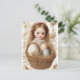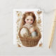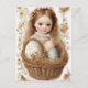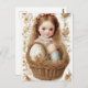 Um rótulo em uma estrutura de trabalho aberto para um pacote de ovos de codorniz, um retrato de uma garota fofa se fechando com uma cesta de ovos entre codornizes, gráficos, detalhamento, padrões, pequenos ovos redondos com grandes manchas multicoloridas, estilo de livro de histórias para crianças, cores mudas, estilo de aquarela