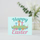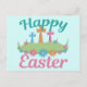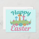 Belos cartões postais de Felz pascoa para um cristão celebrando a ascensão de Jesus Cristo no domingo de Páscoa com bonito rosto e cor-de-rosa e cruzes sobre um campo verde de flores. Um cartão postal de Páscoa bonitinho em cores adoráveis.