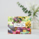 Cartão de agradecimento com uma fotografia da tradição do feriado de Ação de Graças. Uma mesa posta com cornucópia, legumes e frutas da colheita.