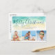 Mande saudações de estação quente com este cartão de Natal de praia. O cartão com fotos costeiro apresenta uma onda de aquarela verde-marinha em uma costa arenosa. Texto editável no topo da onda lê "Feliz Natal" em letra de caligrafia azul-verde. Três fotos estão localizadas abaixo da onda pintada. Para personalizar, adicione seus nomes e três fotos favoritas. No verso, você pode escrever uma mensagem pessoal mais longa para os destinatários.