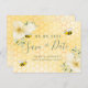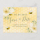 Um cartão de Save the Date para uma festa de 50 anos de aniversário de verão. Fundo amarelo e branco com um padrão de favo de mel. Decorado com flores tropicais amarelo claro e creme, hibiscos e abelhas felizes. Modelos para data e nome/idade 50. Letras verdes e cinzas. O texto: Save the Date é escrito com um estilo de letra manuscrita grande e moderno.