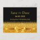 Estilo elegante, clássico, glamouroso e feminino 100ª festa de aniversário, salve o cartão-postal. Uma fita e um arco dourados falsos. Fundo preto. Com o texto: Salve a data na frente, escrita com uma letra de bloco moderna. Modelos da data e nome/texto.