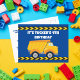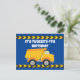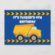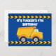 Convite de festa de aniversário personalizado com fita de advertência legal em cartão postal para uma criança que ama veículos de construção em preto e amarelo. Convite de cartão infantil divertido para um menino que ama carros e caminhões basculantes. Personalize com o nome da sua criança e detalhes da festa nos cartões postais azuis.