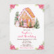 Este convite de festa de aniversário elegante e festivo apresenta uma casa de pão de mel em aquarela e belas flores de poinsettia rosa. O texto combina fontes manuscritas e sem serifa para um visual moderno e sofisticado. O boneco de neve, as árvores de pinheiro decoradas e a coroa de Natal adicionam um toque festivo. Isso é perfeito para festas de aniversário de Natal.