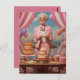 Senhora idosa caprichosa e extravagante com um conjunto de listras rosa e cortinas combinando celebrando seu aniversário