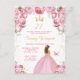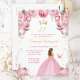 Este convite de festa de aniversário elegante e glamoroso apresenta uma bela princesa com cabelos castanhos em um vestido de baile rosa. O texto combina caligrafia manuscrita e fontes modernas sem serifa para um visual sofisticado e elegante. Os arranjos florais, borboleta e confetes dourados criam a combinação perfeita de rústico e chique.