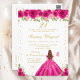 Este convite de festa de aniversário elegante e glamoroso apresenta uma bela princesa com cabelos castanhos avermelhados e pele clara em um vestido de baile rosa quente. O texto combina caligrafia manuscrita e fontes modernas sem serifa para uma aparência sofisticada e elegante. Os arranjos florais, borboletas e confetes dourados criam a combinação perfeita de rústico e chique.