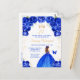 Este convite de festa de aniversário elegante e glamoroso apresenta uma bela princesa com cabelos castanhos em um vestido azul real. O texto combina fonte manuscrita e fontes modernas sem serifa para um visual sofisticado e elegante. Os arranjos florais, borboleta e confetes dourados criam a combinação perfeita de rústico e chique.