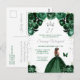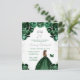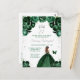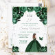 Este convite de festa de aniversário elegante e glamoroso apresenta uma bela princesa com cabelos castanhos em um vestido de baile verde escuro. O texto combina caligrafia manuscrita e fontes modernas sem serifa para um visual sofisticado e elegante. Os arranjos florais, borboleta e confetes prateados criam a combinação perfeita de rústico e chique.