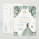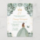 Este convite de aniversário elegante e glamoroso apresenta uma bela princesa com cabelo castanho em um vestido de baile verde salvia. O texto combina caligrafia manuscrita e fontes modernas sem serifa para um visual sofisticado e clássico. Os arranjos florais, borboleta e confetes dourados criam a combinação perfeita de rústico e chique.