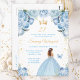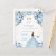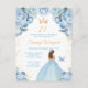 Este convite de aniversário elegante e glamoroso apresenta uma bela princesa com cabelo castanho num vestido azul claro. O texto combina caligrafia manuscrita e fontes modernas sem serifa para um visual clássico e sofisticado. Os arranjos florais, a borboleta e os confetes dourados criam a combinação perfeita de rústico e chique.