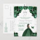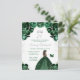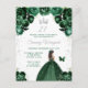 Este convite de aniversário elegante e glamoroso apresenta uma bela princesa com cabelo castanho em um vestido de baile verde escuro. O texto combina caligrafia manuscrita e fontes modernas sem serifa para um visual sofisticado e clássico. Os arranjos florais, borboleta e confetes prateados criam a combinação perfeita de rústico e chique.