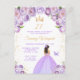 Este convite de festa de aniversário elegante e glamoroso apresenta uma bela princesa com cabelo castanho em um vestido de baile roxo claro. O texto combina caligrafia manuscrita e fontes modernas sem serifa para um visual sofisticado e clássico. Os arranjos florais, borboleta e confetes dourados criam a combinação perfeita de rústico e chique.