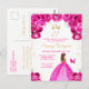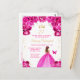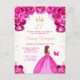 Este convite de aniversário elegante e glamoroso apresenta uma bela princesa com cabelos castanhos em um vestido de baile rosa quente. O texto combina caligrafia manuscrita e fontes modernas sem serifa para um visual sofisticado e elegante. Os arranjos florais, borboleta e confetes dourados criam a combinação perfeita de rústico e chique.