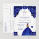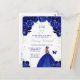 Este convite de aniversário elegante e glamoroso apresenta uma bela princesa com cabelos loiros num vestido azul escuro. O texto combina caligrafia manuscrita e fontes modernas sem serifa para um visual clássico e sofisticado. Os arranjos florais, borboleta e confetes prateados criam a combinação perfeita de rústico e chique.