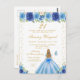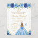 Este convite de aniversário elegante e glamoroso apresenta uma bela princesa com cabelo loiro e pele clara em um vestido azul de baile. O texto combina caligrafia manuscrita e fontes modernas sem serifa para um visual sofisticado e clássico. As arranjos florais, borboletas e confetes dourados criam a combinação perfeita de rústico e chique.