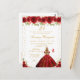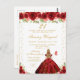 Este convite de festa de aniversário elegante e glamoroso apresenta uma bela princesa com cabelo loiro e pele clara em um vestido de baile vermelho. O texto combina caligrafia manuscrita e fontes modernas sem serifa para um visual sofisticado e clássico. As arranjos florais, borboletas e confetes dourados criam a combinação perfeita de rústico e chique.