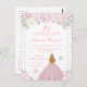 Este convite de aniversário de inverno elegante e glamoroso apresenta uma bela princesa com cabelos loiros e pele clara em um vestido de baile rosa. O texto combina caligrafia manuscrita e fontes modernas sem serifa para um visual sofisticado e elegante. Os arranjos florais, flocos de neve e confetes prateados criam a combinação perfeita de rústico e chique.