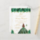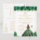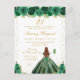 Este convite de festa de aniversário elegante e glamoroso apresenta uma bela princesa com cabelos castanhos vermelhos e pele clara em um vestido de baile verde. O texto combina caligrafia manuscrita e fontes modernas sem serifa para um visual sofisticado e elegante. Os arranjos florais, borboletas e confetes dourados criam a combinação perfeita de rústico e chique.