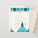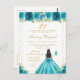 Este convite de aniversário elegante e glamoroso apresenta uma bela princesa com cabelos escuros e pele morena em um vestido de baile azul turquesa. O texto combina caligrafia manuscrita e fontes modernas sem serifa para um visual sofisticado e elegante. As arranjos florais, borboletas e confetes dourados criam a combinação perfeita de rústico e chique.
