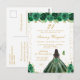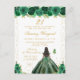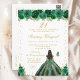 Este convite de festa de aniversário elegante e glamoroso apresenta uma bela princesa com cabelos escuros e pele escura em um vestido de baile verde. O texto combina escrita à mão e fontes modernas sem serifa para um visual sofisticado e clássico. As arranjos florais, borboletas e confetes dourados criam a combinação perfeita de rústico e chique.