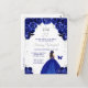 Este convite de festa de aniversário elegante e glamoroso apresenta uma bela princesa de pele morena em um vestido azul escuro. O texto combina fonte manuscrita e fontes modernas sem serifa para um visual sofisticado e elegante. Os arranjos florais, a borboleta e os confetes prateados criam a combinação perfeita de rústico e chique.