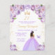 Este convite de festa de aniversário elegante e glamoroso apresenta uma bela princesa com pele morena em um vestido de baile roxo claro. O texto combina caligrafia manuscrita e fontes modernas sem serifa para um visual sofisticado e elegante. Os arranjos florais, borboleta e confetes dourados criam a combinação perfeita de rústico e chique.