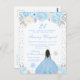 Este convite de aniversário de inverno elegante e glamoroso apresenta uma bela princesa com cabelos castanhos e pele morena em um vestido azul de baile. O texto combina caligrafia manuscrita e fontes modernas sem serifa para um visual sofisticado e clássico. Os arranjos florais, flocos de neve e confetes prateados criam a combinação perfeita de rústico e chique.