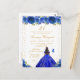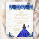 Este convite de festa de aniversário elegante e glamoroso apresenta uma bela princesa com cabelos escuros e pele morena em um vestido azul real. O texto combina caligrafia manuscrita e fontes modernas sem serifa para um visual sofisticado e elegante. Os arranjos florais, borboletas e confetes dourados criam a combinação perfeita de rústico e chique.