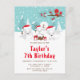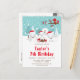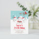 Este convite de aniversário fofo e divertido apresenta uma adorável família de raposas árticas em um cenário de um país das maravilhas de inverno com árvores cobertas de neve e um pássaro vermelho em um galho com azevinho. As raposas com chapéus de Papai Noel adicionam um toque festivo. Ao fundo, há um céu azul-esverdeado teal e flocos de neve caindo. O texto combina fontes decorativas e sem serifa para um visual elegante e moderno. Isso é perfeito para uma festa de aniversário com tema de Natal.