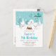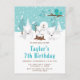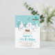 Este convite de aniversário fofo e divertido apresenta uma adorável família de raposas árticas em um cenário de inverno maravilhoso com árvores nevadas e um pássaro azul em um galho com azevinho. Ao fundo, há um céu azul-esverdeado e flocos de neve caindo. O texto combina fontes decorativas e sem serifa para um visual elegante e moderno. Isso é perfeito para um aniversário com tema de Natal ou inverno.