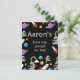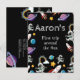 Convites de festa de primeiro aniversário no espaço sideral com fundo de céu estrelado, planetas do sistema solar espalhados pelas bordas, uma nave espacial, astronauta e um modelo de celebração de 1º aniversário moderno e fácil de personalizar.