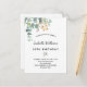 Um convite elegante para uma festa de aniversário 50ª (ou qualquer idade). Um fundo branco chic. Decorados com folhas verdes de eucalipto, prigos, verde e um puré de ouro. Personalize e o nome e os detalhes da festa. Letras negras. Traseiro: design postal. Dica: Se você não quiser que pareça um cartão postal, clique em personalizar, vá para o verso e remova o divisor e o carimbo de posto.